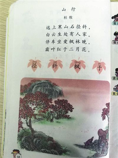 安徽一所小学的章老师向记者展示了2001年版的人教版语文二年级(上册)课本,其中,乡音无改鬓毛衰,“衰”已标注为“shuāi”,远上寒山石径斜,“斜”也已标注为“xié”。