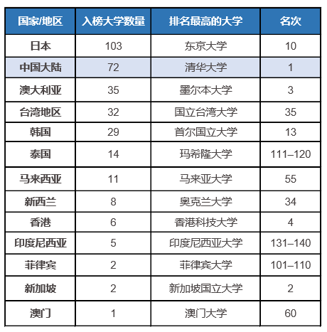 日本有103所大学进入排名,排名第一。中国大陆排名第二,拥有72所大学,其他在排名中靠前的国家/地区是澳大利亚(35所)、台湾地区(32所)、韩国(29所)和泰国(14所)。