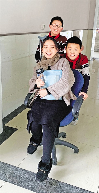 王老师说,刚开始她还有些不好意思,后来拗不过学生,只好“享受”两个暖男的贴心服务。“两个小男生看我拄着拐杖,心疼我,就把我的课表记住了,只要我有课,就会来办公室,让我坐到椅子上,推着我进教室。”